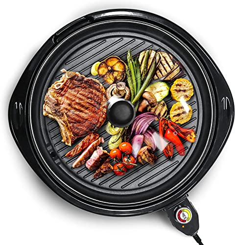 Bring the fun of outdoor BBQs into your home with the Elite Gourmet Smokeless Indoor Electric BBQ Grill. This premium grill allows you to prepare mouth-watering meals for your family in the comfort of your own kitchen. Its large 14" grilling surface and adjustable temperature control make it easy to grill all your favorite foods at once. The circular heating element ensures fast and even heating, while the nonstick coating prevents food from sticking. With dishwasher safe parts, cleaning up is a breeze. This indoor grill comes with a 1-year warranty and includes grill base, drip tray, extra large non-stick grill plate, glass lid, thermostat control knob, and instruction manual with recipe guide.
