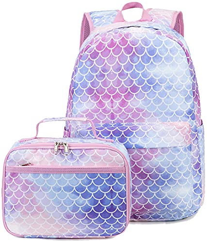 The CAMTOP Backpack for Girls Kids School Backpack with Lunch Box Preschool Kindergarten BookBag Set is a beautiful and practical set designed for children aged 3-8 years. The set includes a mermaid pattern printed backpack and an insulated lunch bag, making it perfect for back to school or casual day trips. The backpack features a large main compartment, accessory zip pocket, and side pockets for water bottles. It also has padded adjustable straps and a top padded handle for comfortable carrying. The lunch bag is safe, BPA free, and eco-friendly, with a zippered front pocket and inner mesh pouch. Made of durable water-resistant polyester, this set is lightweight and easy to clean. Recommended for preschool, kindergarten, and elementary school students, as well as outdoor activities.