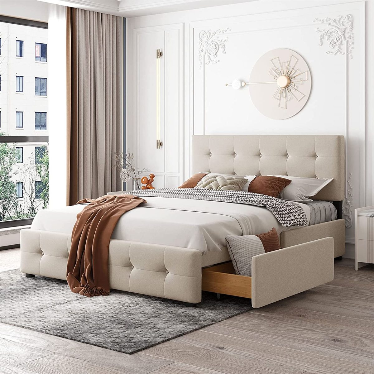 Experience an enhanced sleeping environment by opting for upholstered beds that provide comfort, convenience, and style. This dreamy platform storage bed features a breathable non-woven premium linen fabric, high-density sponge cushioning, and an adjustable headboard that can hold eight to 12 inch mattresses. With its box spring structure, the bed frame can support up to 850 pounds. Plus, it has four drawers on wheels for easy access to your items. Upgrade to luxury and sort your bedroom clutter with this bed frame.