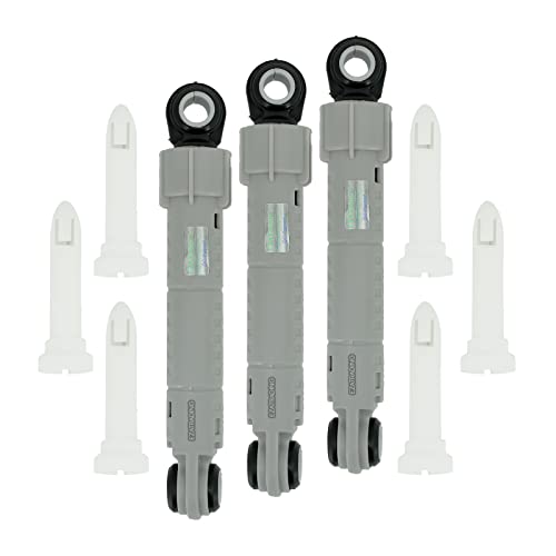The 383EER3001J Washer Shock Absorber Replacement for LG Washers is an exact fit for LG front load washers. It comes as a set of three shock absorbers and six mounting pins, with a 1-year replacement warranty. If your washer is running erratically, making noise, or shaking, this shock absorber replacement could solve the problem. It is a plug and play solution that does not require modification or adapters. For safety, make sure to turn off electrical connections, work with dry hands, and take clear pictures for easier replacement. Compatible with various LG washer models, this replacement part offers convenience and reliability.