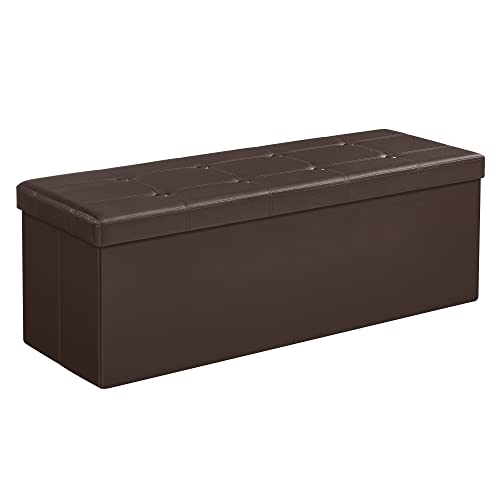 The SONGMICS 43 Inches Folding Storage Ottoman Bench is a great storage solution for your bedroom, living room, or hallway. It is made of quality MDF and can hold up to 660 lb, so you can sit on it comfortably. This padded storage bench has 31.7 gal. of space and folds flat for space-saving storage. It is easy to assemble and can be used as a bed end bench, shoe bench, footrest, or coffee table. The SONGMICS Ottoman Bench comes in a brown faux leather finish that adds an aesthetic look to any room.