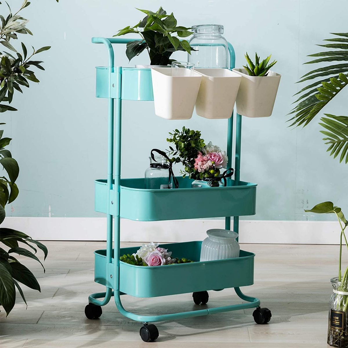 Three-tier rolling carts are pretty easy to find online, and here’s another option for you to consider. This particular one by Pipishell features lockable casters, a removable handle, and swivel wheels for easy maneuvering. Additionally, this utility cart is made out of durable metal so it is sure to last a long while. You can use this cart in the living room, laundry room, or the office – this cart can deliver wherever you need it.