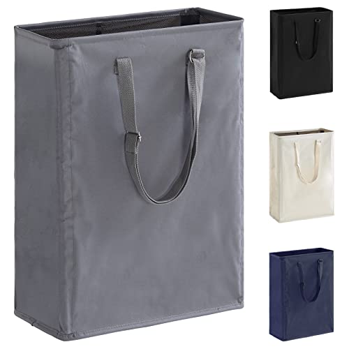 The TECHMILLY Slim Laundry Hamper is a space-saving storage solution for your laundry needs. With its slim and tall design, it can fit perfectly in tight spaces such as narrow closets, small bathrooms, and RVs. The laundry hamper features adjustable handles to accommodate people of different heights and a freestanding structure for stability. It is made of sturdy 600D Oxford fabric, ensuring durability, and is waterproof to keep odors and moisture at bay. Additionally, the hamper is foldable, making it easy to store when not in use. Available in a stylish grey color, this laundry hamper offers convenience and efficiency in organizing your dirty clothes.