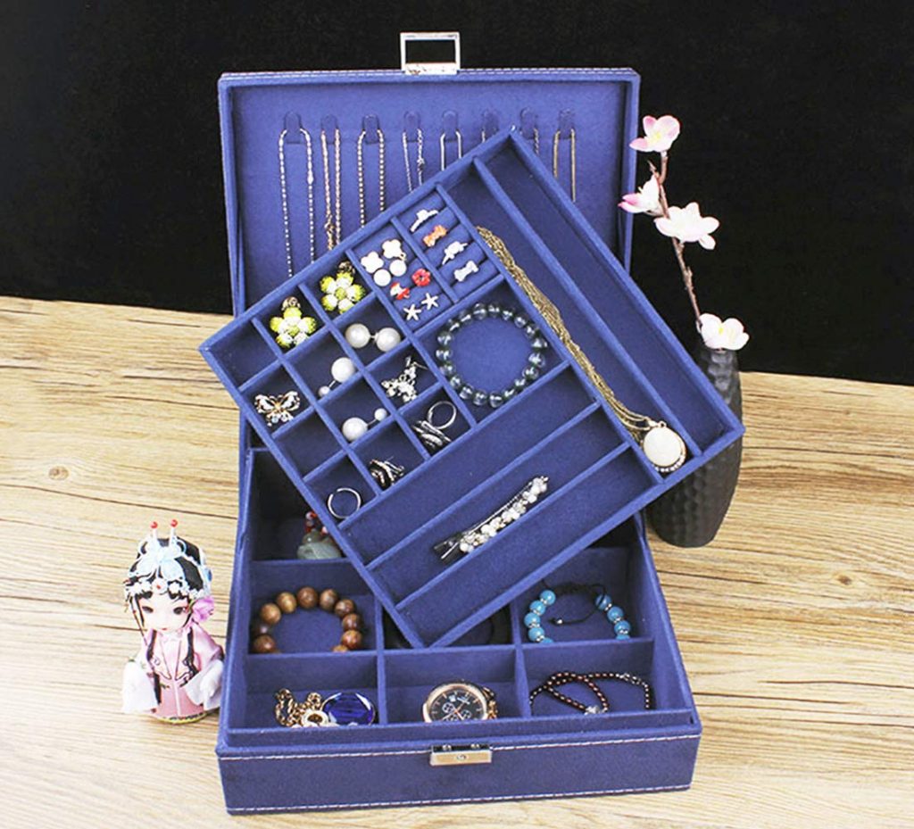 Available in four different colors including pink, black, blue, and white, this jewelry box is compact and lightweight. Furthermore, it can easily store all your rings, earrings, and necklaces. Although the box is designed to be small, there are plenty of small compartments inside to keep each item separate from the other (to prevent entanglements).