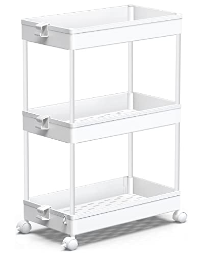 The SPACEKEEPER Storage Rolling Cart is a 3-tier mobile storage solution made of plastic, suitable for tight spaces in your home for storage. Its dimensions are 8.66Lx15.75Wx24.00H and it comes with four side hoops to provide additional spaces for storage. It can be installed easily, as it snaps together with no issues and comes with wheels to offer enhanced convenience. The plastic surface lends it blending capability with office décor; hence it's fit for use in offices, classrooms, dorm rooms, and maintaining cubicles. It also comes with adjustable shelves that let you adjust the size from 2 to 3 shelves for wide-ranging applications.