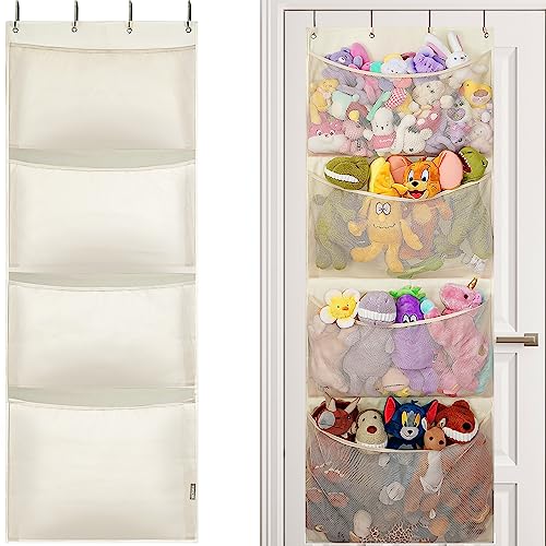 Tired of tripping over toys and clutter? The VICTOR'S Stuffed Animal Storage is the perfect solution! This over the door organizer features 4 large hidden pockets, allowing you to store not only stuffed animals, but also baby items, clothes, and more. Made of durable fibers and dense mesh, it is sturdy and easy to install. The breathable mesh pockets keep toys fresh and clean, while an elastic strap prevents them from falling out. Hang it over the door or attach it to the wall to save space. With its visual design, it adds a decorative touch to any room. Say goodbye to clutter and hello to organization with VICTOR'S Stuffed Animal Storage!