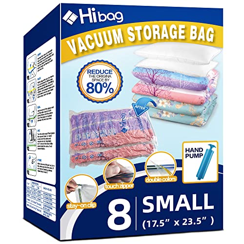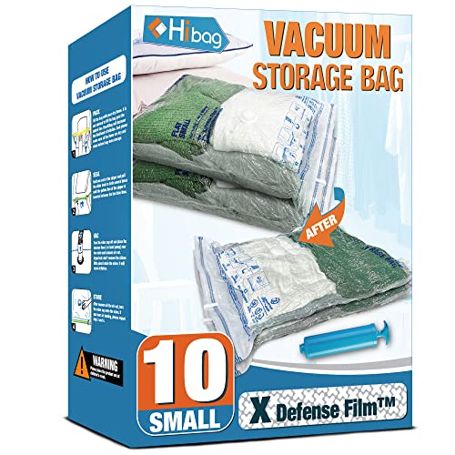 The HIBAG Small Vacuum Storage Bags are the perfect solution for storage, offering up to 4x more space to store your seasonal clothes, sweaters, and pillows. These vacuum bags are made with durable and flexible PA&PE material that is 30% thicker, ensuring long-lasting use. They are equipped with advanced double-zip seal and triple-seal valve to effectively vacuum air out and prevent anything from going back in. The bags can be easily used with any standard vacuum cleaner hose, and a small hand pump is also included for convenient travel use. With a multi-color design and compact size, these bags are perfect for packing, moving, and storing items. Overall, the HIBAG Small Vacuum Storage Bags are a reliable and efficient solution for maximizing storage space.