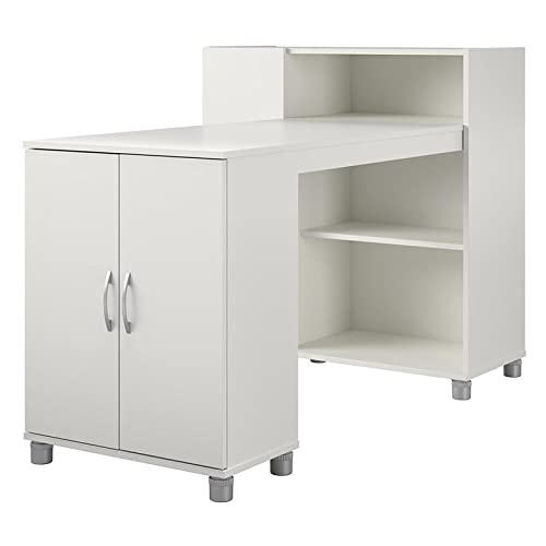 Get organized with the Lory Hobby and Craft Desk with Storage Cabinet by Systembuild Evolution. This desk is made of laminated particleboard and features European style hinges for a look that's both attractive and affordable. It comes with 2 cabinets with 4 shelves (2 fixed, 2 adjustable) for closed storage, as well as 3 open storage shelves. The ample desk top provides enough space for crafting, folding clothes, or working from home. With its sleek white color and functional design, this desk is perfect for organizing your hobbies and crafts.