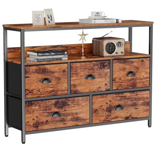 The WLIVE Dresser TV Stand is an excellent storage solution for your TV up to 45 inches. The unit comes with roomy storage space, five foldable deep drawers, and open shelves. Besides, the fabric dresser is versatile and ideal for wherever you want to keep clutter under control. The product's steel frame and water-resistant wood top offer stable support and ensure years of use. It's easy to assemble and adjust with 4 adjustable feet, allowing you to protect your floors from scratches. Overall, the product is multipurpose, durable, and attractive and provides endless organizational possibilities.