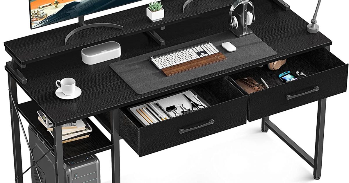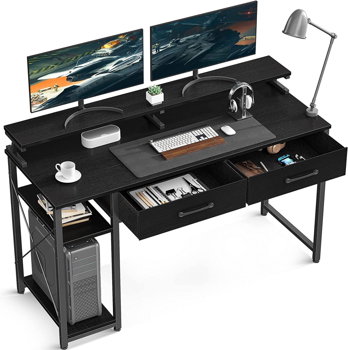 Take workspace organization to a new level with this small writing desk! Its surface offers ample room for writing, working, and gaming, plus plenty of legroom for optimal comfort. In addition, you can have convenient storage with its built-in drawers and adjustable shelves. Plus, with open shelves, it makes it easy to access everything you need. With a sturdy metal frame, durable wood board, and adjustable foot pads, this desk ensures stability and longevity every time.