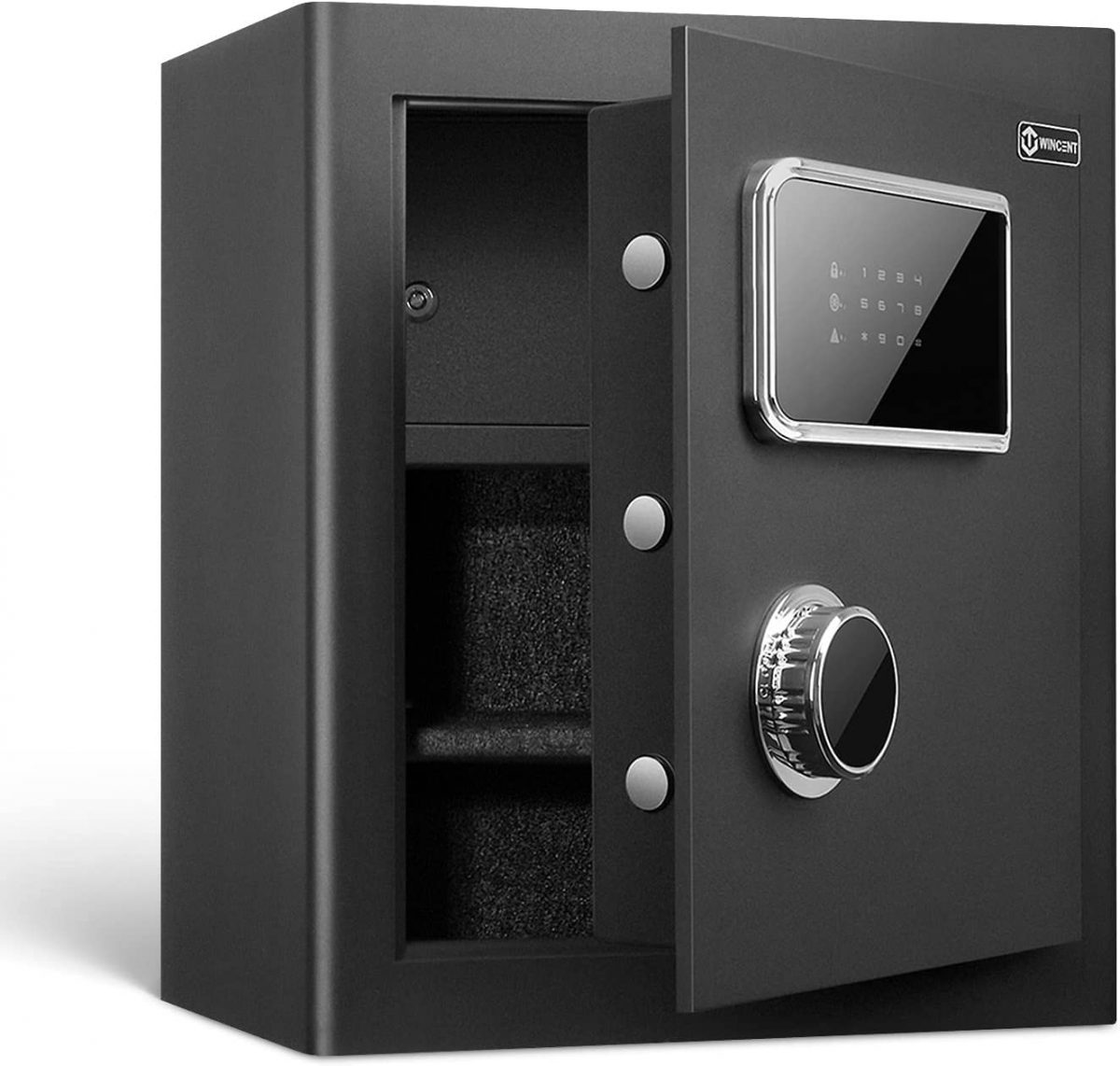 The WINCENT Secure Deluxe Home Security Safe is a dual digital keypad and key access safe with a removable shelf, interior lock box, and alarm system. It features solid steel construction with a tamper-proof design to ensure maximum security. The digital keypad allows quick and easy access, while the key access provides a backup in case of forgotten passwords or battery failure. The interior lock box of this ammo cabinet offers an additional layer of security for smaller items, and the removable shelf allows for customizable storage. Moreover, its alarm system will alert you if the safe is tampered with or moved.